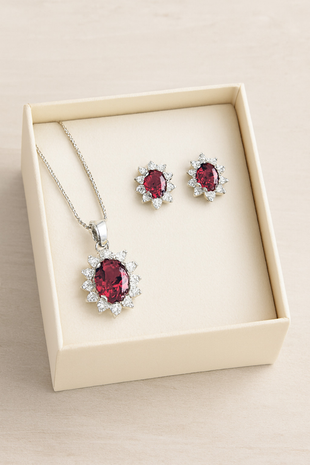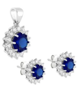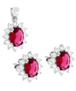 Orecchini e collana halo in argento e zirconi. Rosso Rubino, Verde Smeraldo, Blu Zaffiro.  Orecchini e Collana halo in argento 925 rodiato con zircone ovale (rosso, blu, verde) e giro di zirconi bianchi