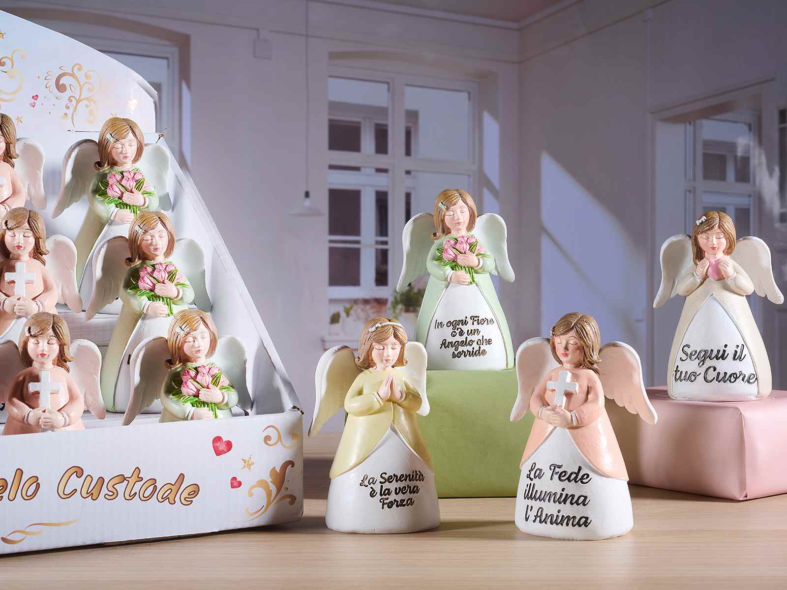Una collezione di quattro angioletti in resina che portano con sé un messaggio unico e un’aura di dolcezza. Perfetti come bomboniera, segnaposto, o piccolo dono per celebrare affetto e protezione.