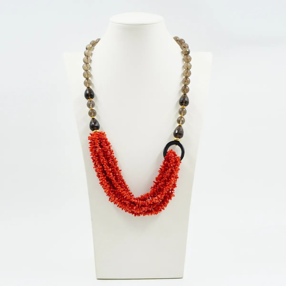 Collana di pietre dure naturali: quarzo fumé, corallo e agata nera con chiusura dorata