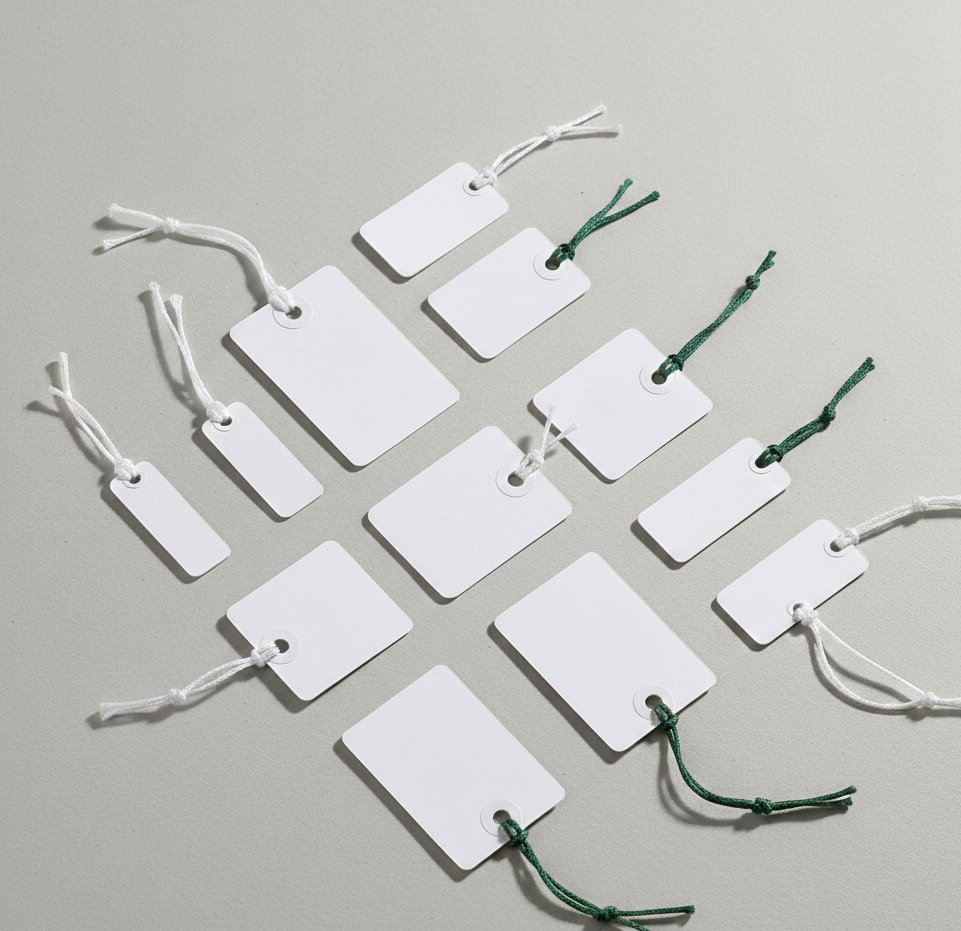 Etichette con filo corto 55mm: discrete, facilissime da utilizzare, svariati modelli. La praticità a portata di mano.