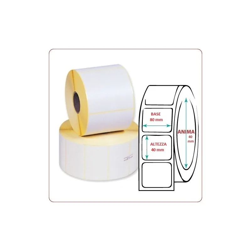 Rotoli etichette adesive mm80(L)xmm40(H), 1150 etichette a rotolo in carta vellum (si stampano con ribbon cera) foro centrale da 40mm. 33 rotoli a confezione