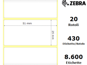 Zebra 3007842-T è un pacchetto contenente 20 rotoli di etichette termiche dirette Z-Perform 1000D. Ogni rotolo contiene 430 etichette nella misura 50,8 mm x 25,4 mm, per un totale di 8600 etichette per scatola.