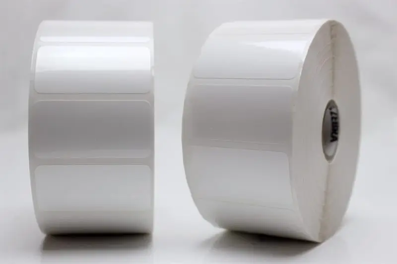 Etichette adesive in poliestere bianco lucido (51x32mm), ideali per stampanti desktop Zebra.