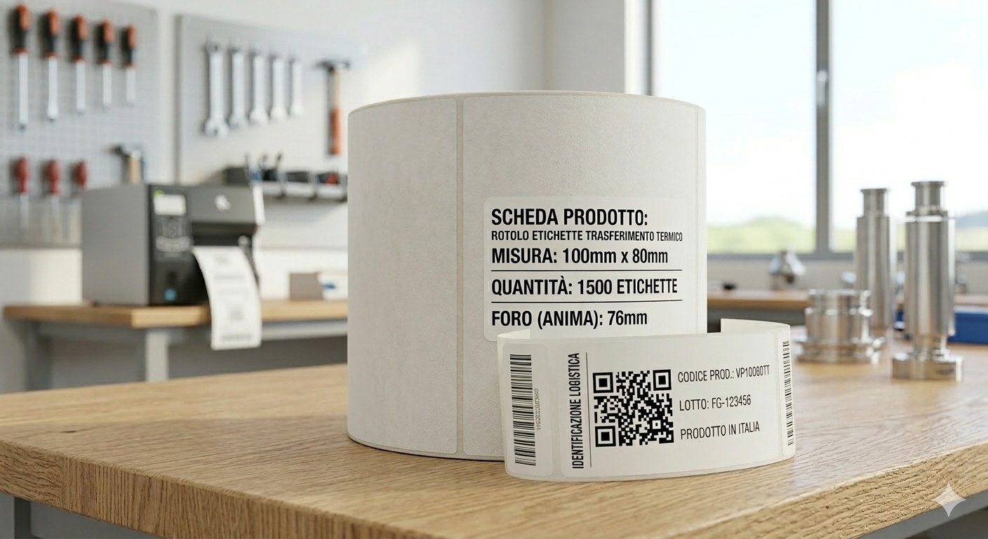 Rotolo etichette 100x80x1500 TT f76. Una misura molto apprezzata perché offre un’ottima superficie di stampa pur mantenendo un profilo più compatto. Rotoli etichette adesive mm100(L) x mm80(H), 1500 etichette a rotolo in carta vellum (si stampano con ribbon cera), foro centrale da 76mm. In confezioni da 4 rotoli