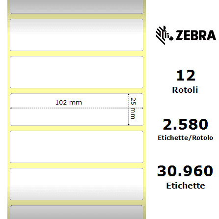 - Dimensioni: Le etichette hanno un formato di 102 mm x 25 mm (larghezza x altezza).