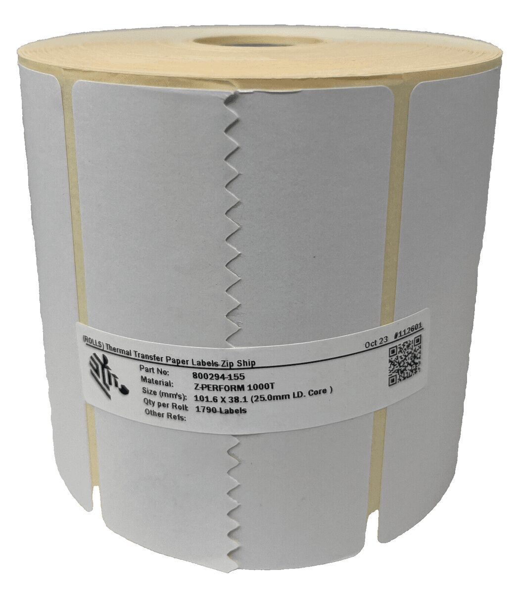 Il prodotto Zebra 800294-155 è un rotolo di etichette a trasferimento termico (Thermal Transfer) in carta, specificamente progettato per le stampanti desktop Zebra.