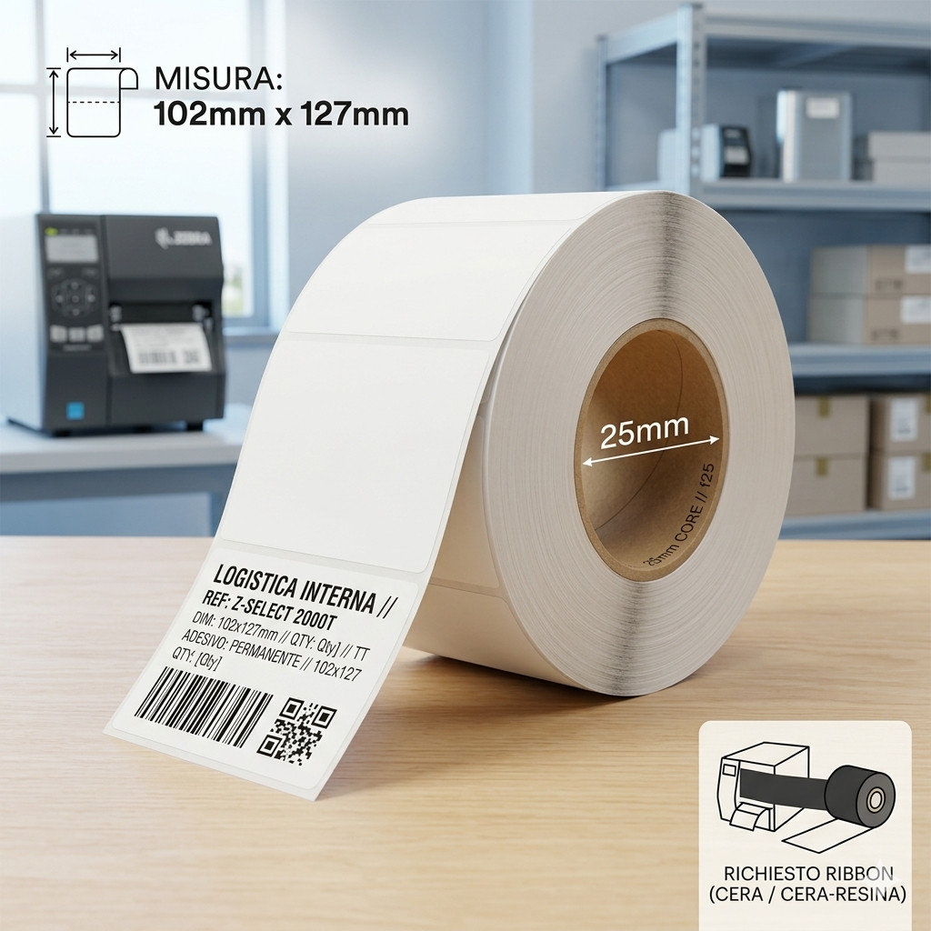 - Tipo di etichetta: Z-Select 2000T (trasferimento termico). Questo significa che per la stampa è necessario un nastro (ribbon) specifico.