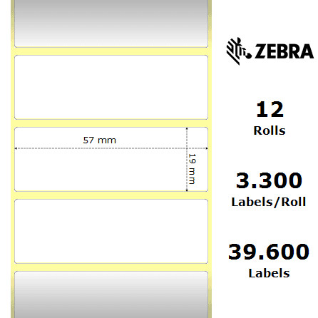 Etichette adesive in poliestere bianco lucido (57x19mm), ideali per stampanti desktop Zebra.